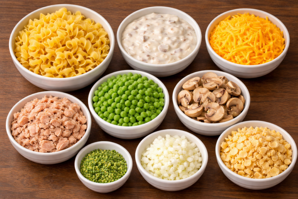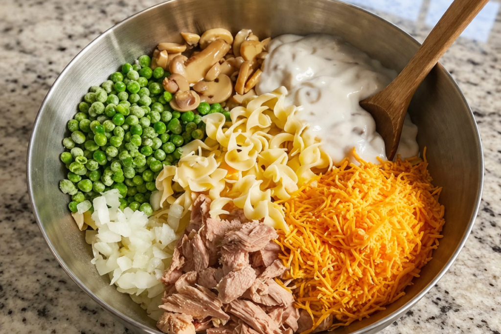 - In a large bowl, combine the noodles, condensed soup, 1 cup of cheese, tuna, peas, mushrooms, and onion. Stir until everything is evenly mixed and well coated.