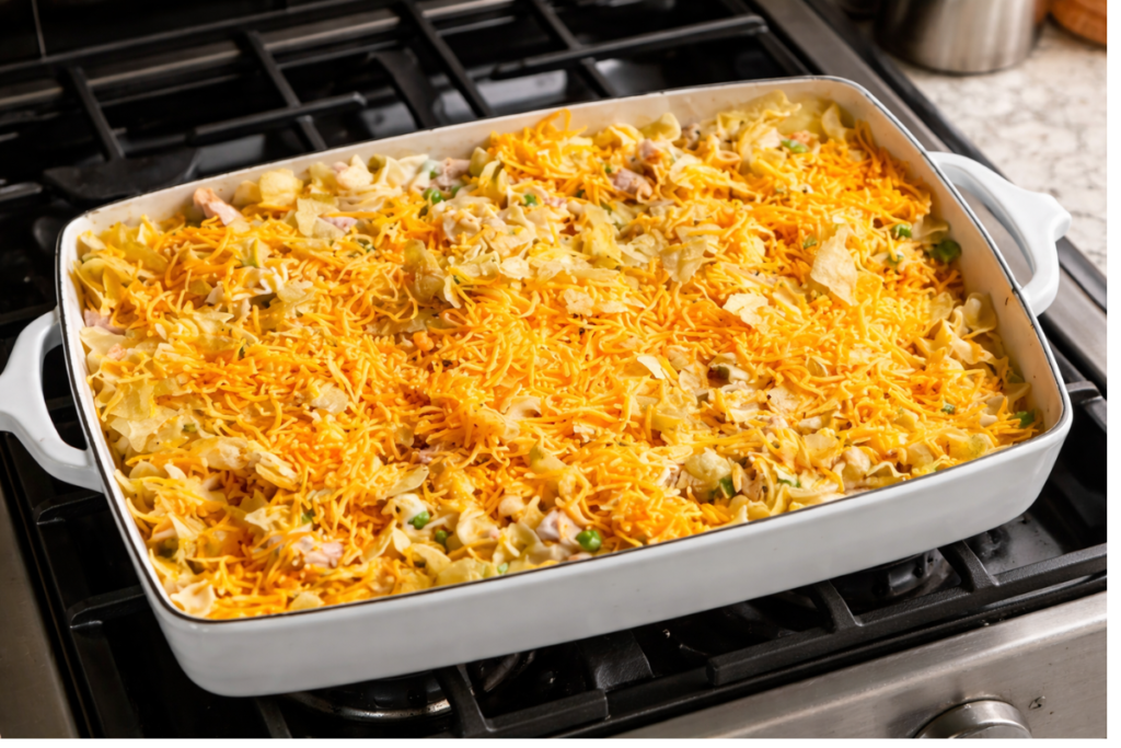 - Sprinkle the remaining 1 cup of cheese over the mixture, then finish by topping it with crushed potato chips.