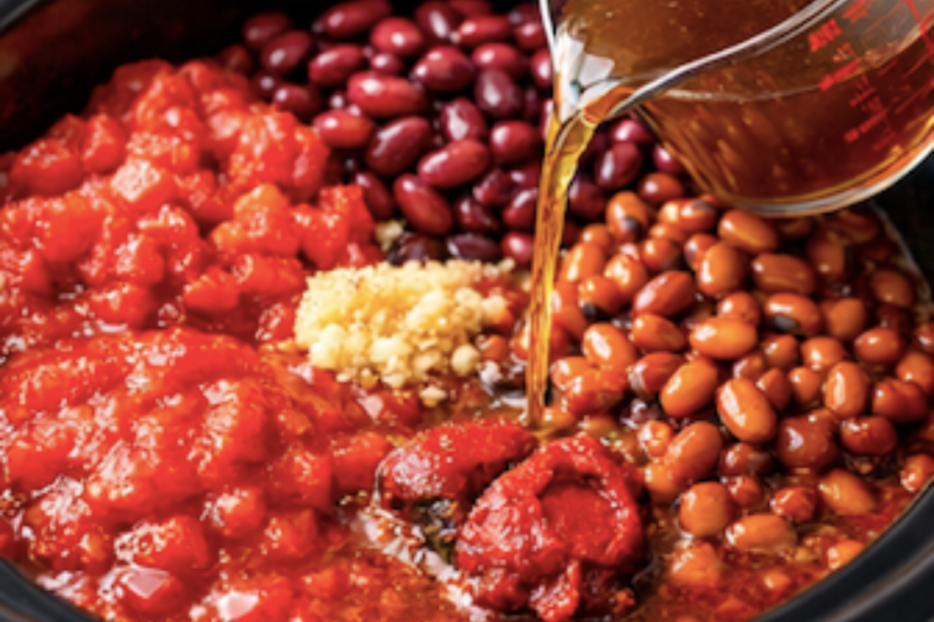 Stir in crushed tomatoes, tomato sauce, diced tomatoes, beef broth, kidney beans, chili beans, tomato paste, and Dr Pepper.