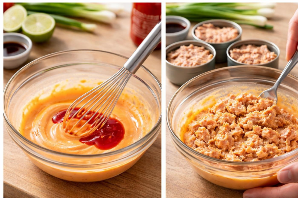 • Combine: Add the tuna to the bowl with the spicy mayo.